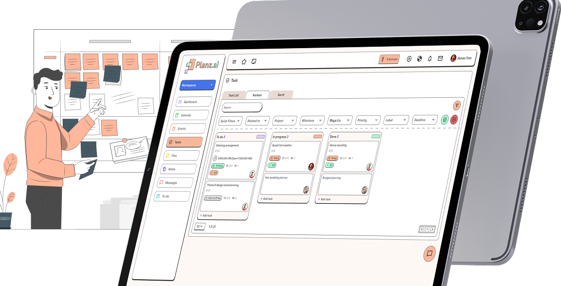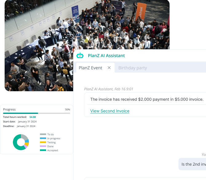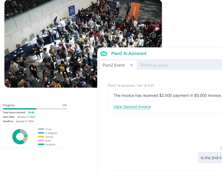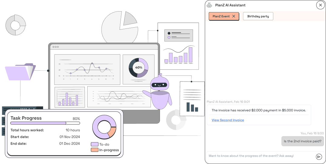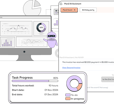 Trí thông minh nhân tạo (AI) của PlanZ tự động theo dõi và báo cáo tiến độ, sử dụng phân tích dự đoán để nâng cao hiệu quả quản lý sự kiện.